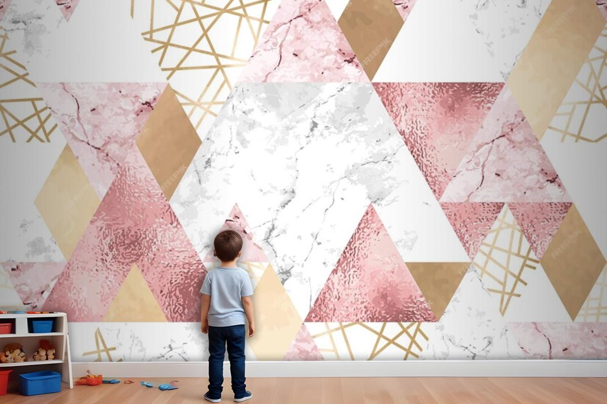 Metalik Çizgilerle Kesintisiz Geometrik Desen Gül Altın Gri Ve Pembe Mermer Üçgenler Çocuk Odası Duvar Kağıdı