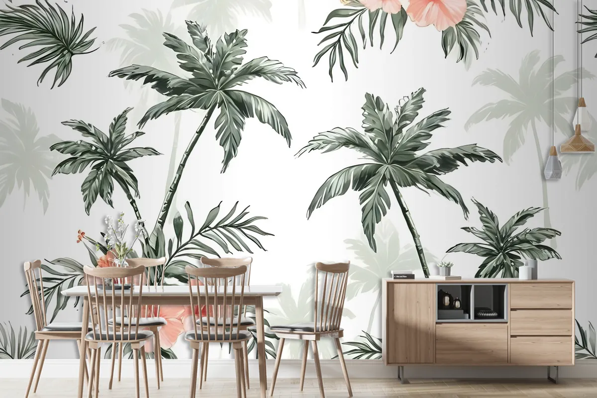 Mirabilis Çiçek Desenli Duvar Kağıdı Ile Tropikal Palmiye Ağacı