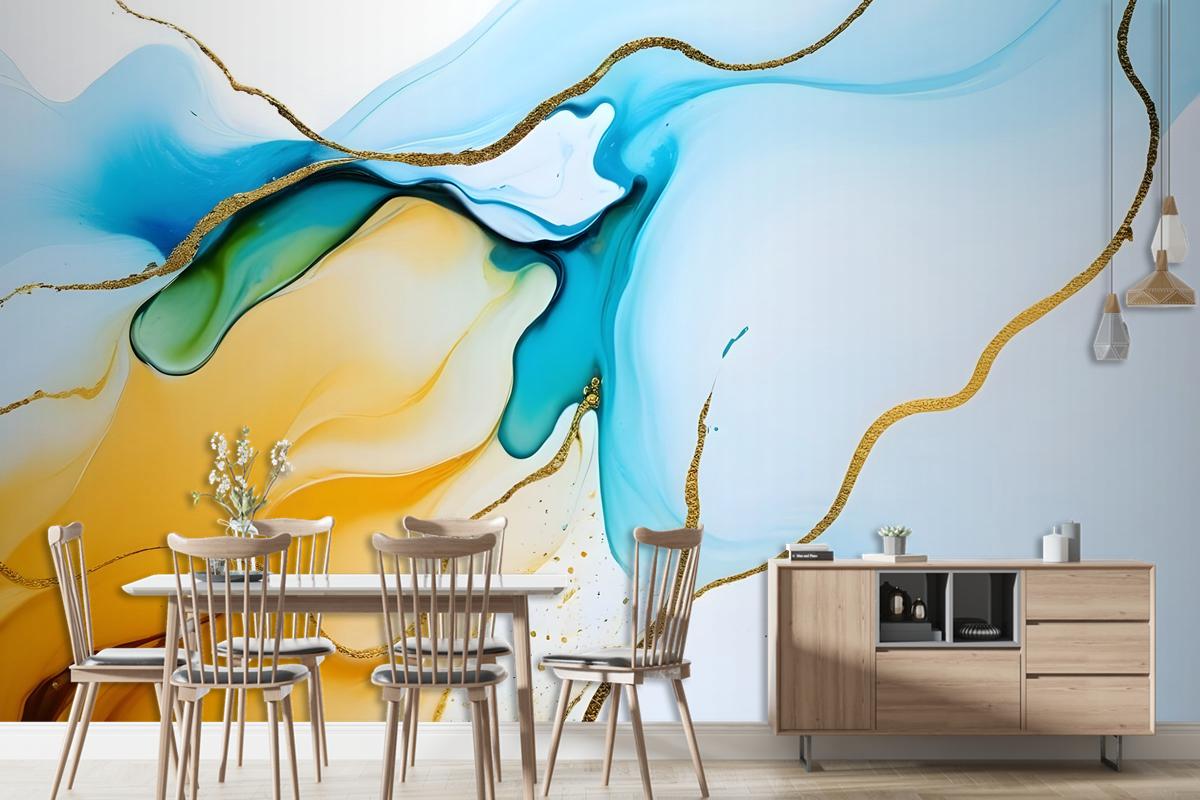 Modern Çizgili Mavi Sarı Suluboya Fırçası Duvar Kağıdı