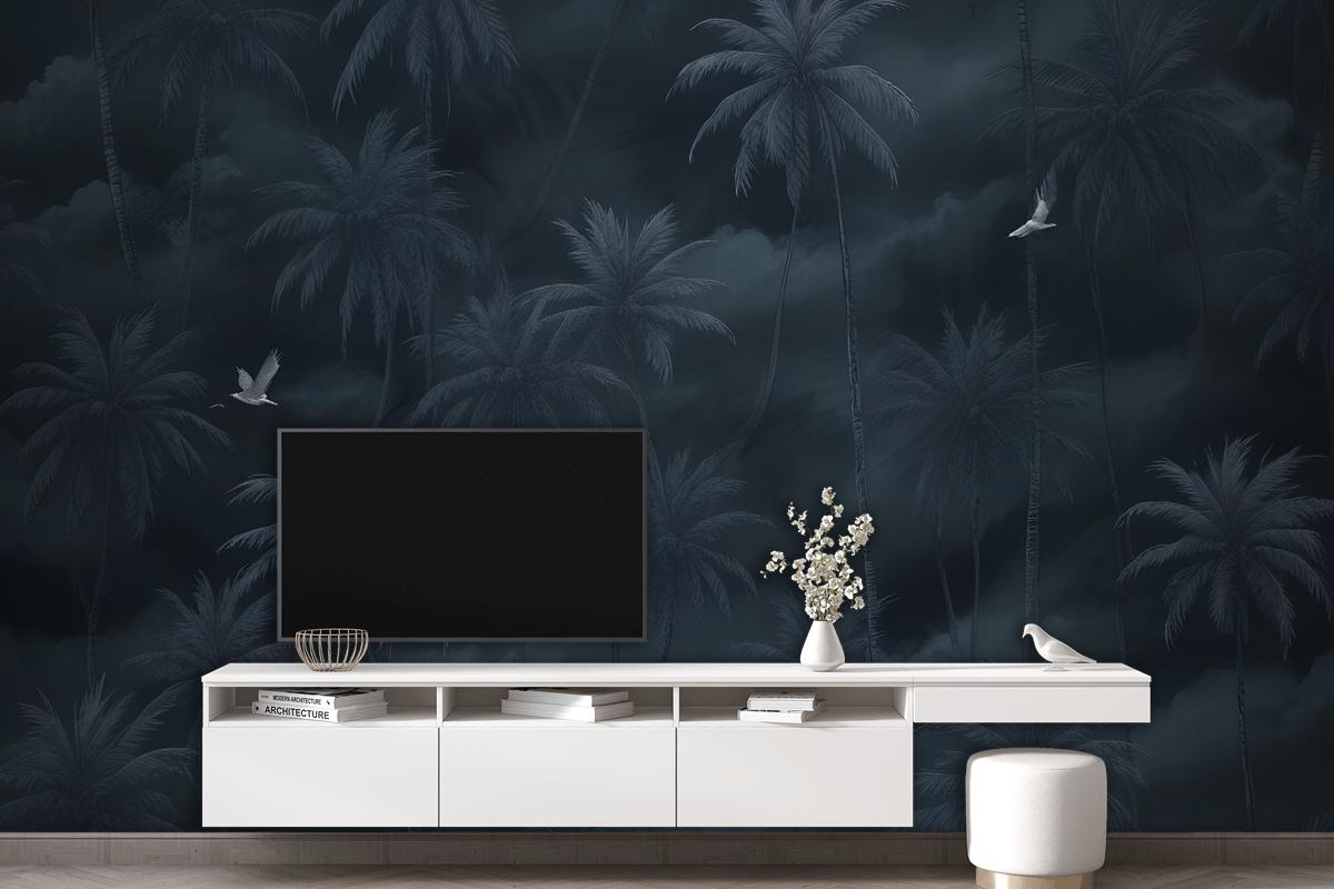 Moody Fırtınalı Gökyüzü Karanlık Tropikal Palmiye Ağaçları Siluetleri Kuşlar Oturma Odası Salon Duvar Kağıdı