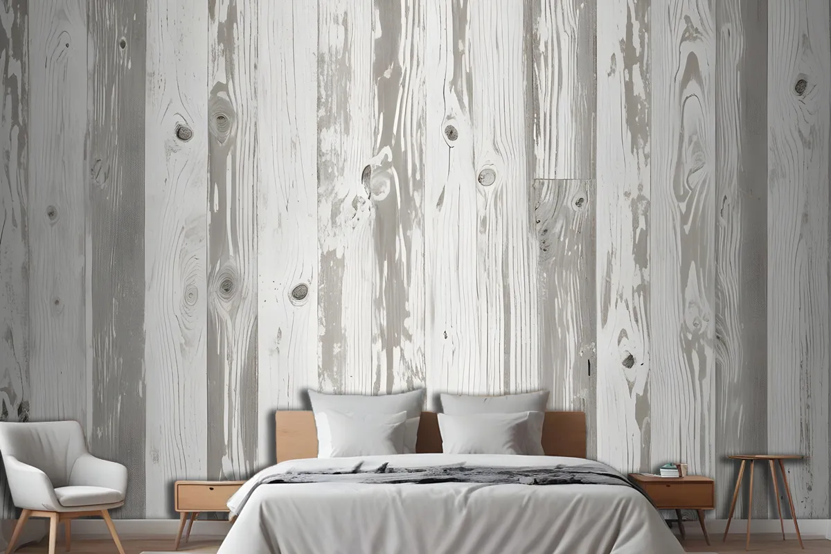 Nötr Baskılı Ahşap Panel Efektli Yatak Odası Duvar Kağıdı