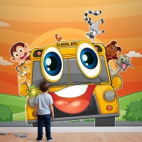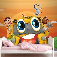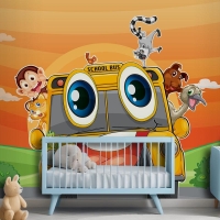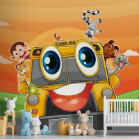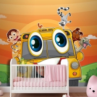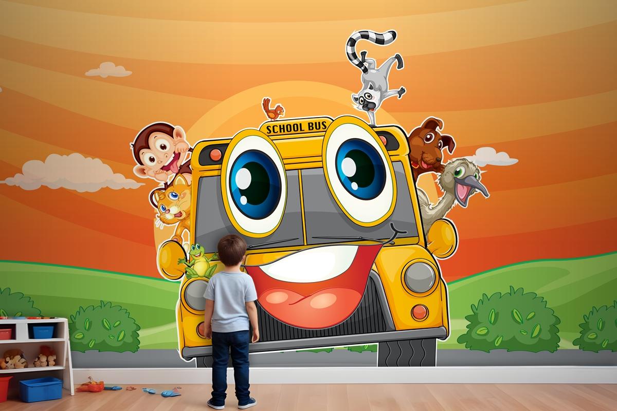 Okul Otobüsünde Çeşitli Hayvanlar Çocuk Odası Duvar Kağıdı