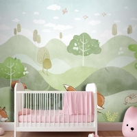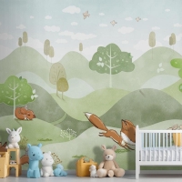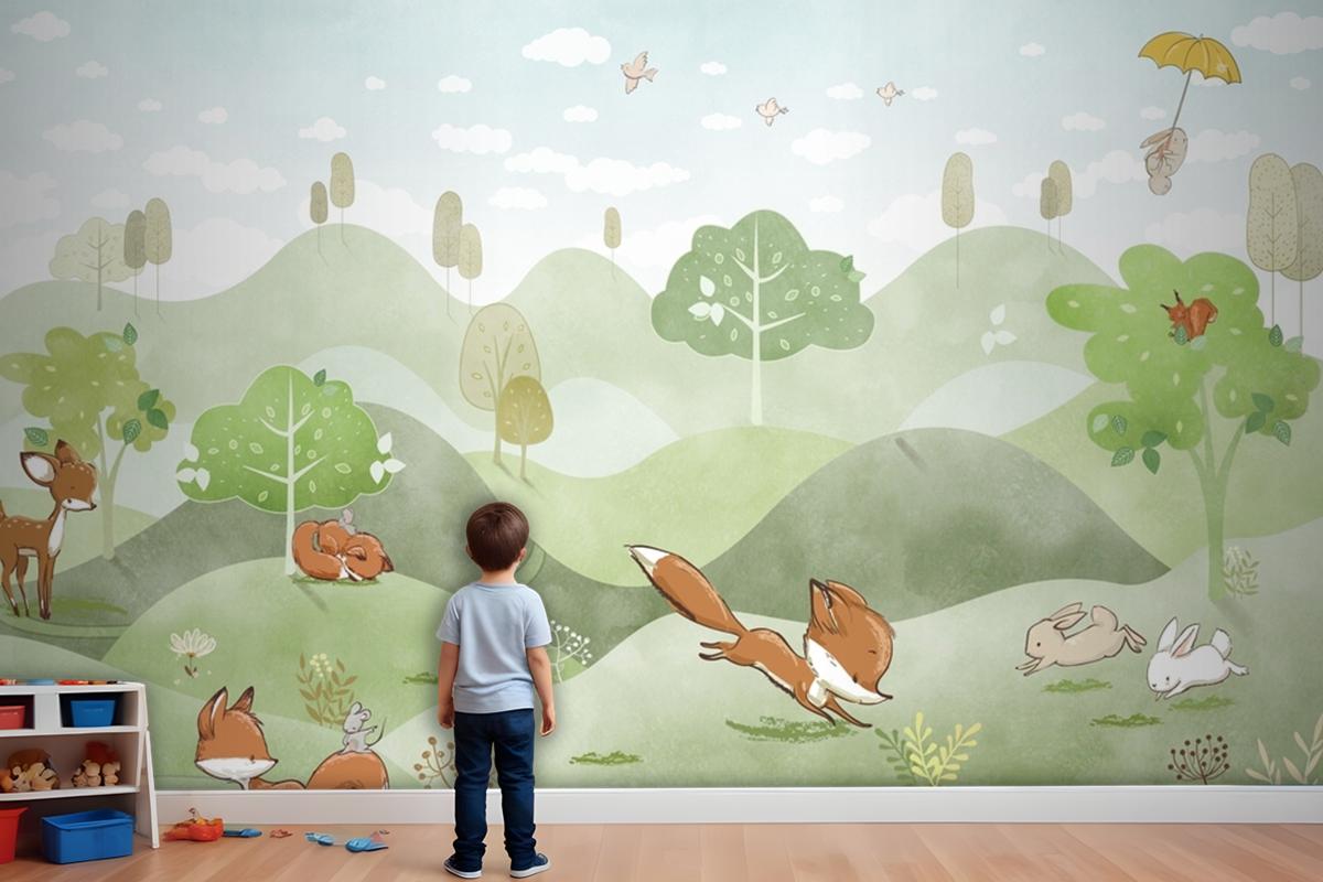 Orman Hayvanları Yeşil Orman Geyik Tilki Tavşan Bebek Odası Duvar Kağıdı