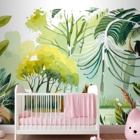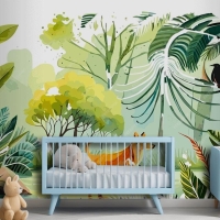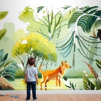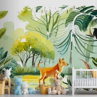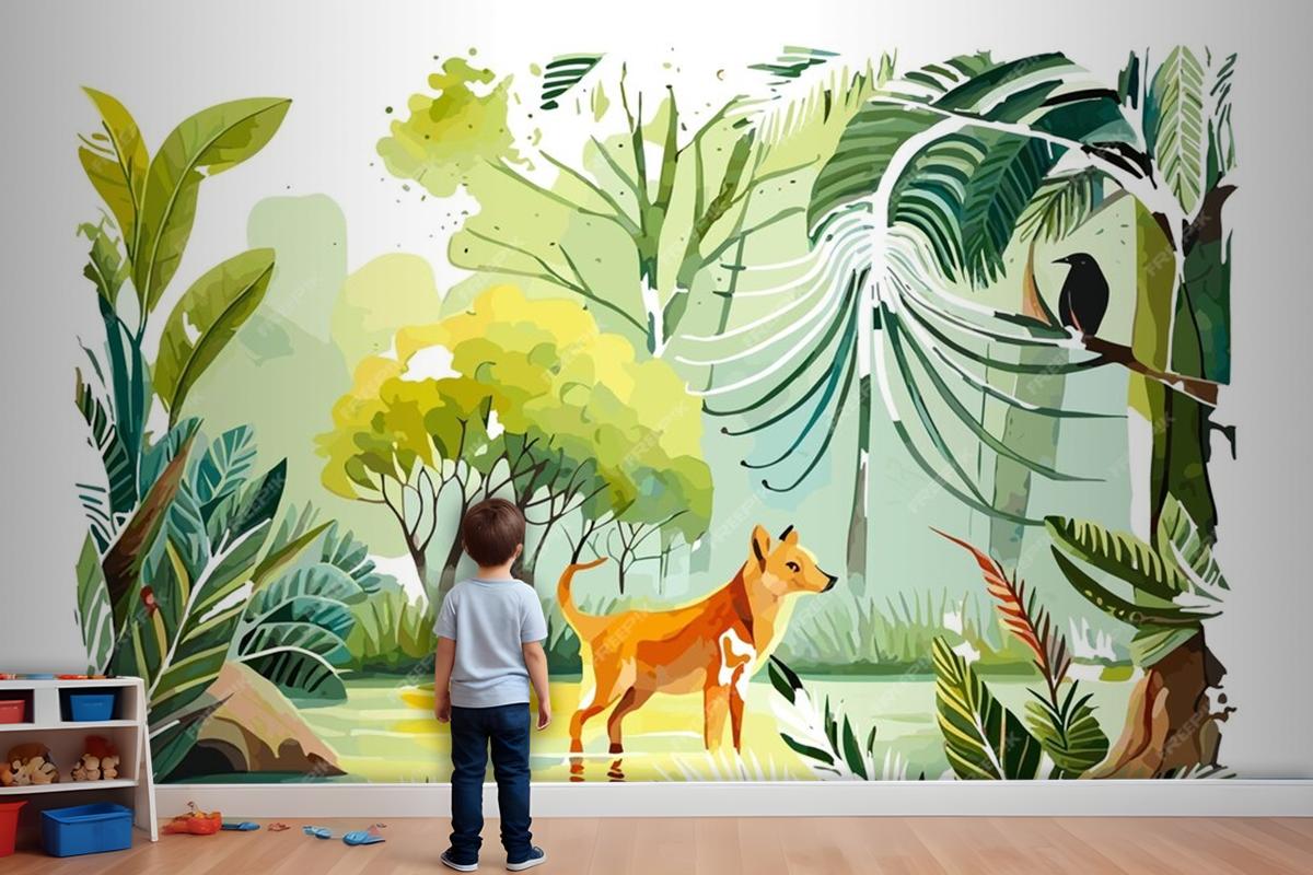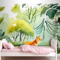 Ormanda Bir Köpek Ve Bir Kuşun Suluboya Resim Çocuk Odası Duvar Kağıdı