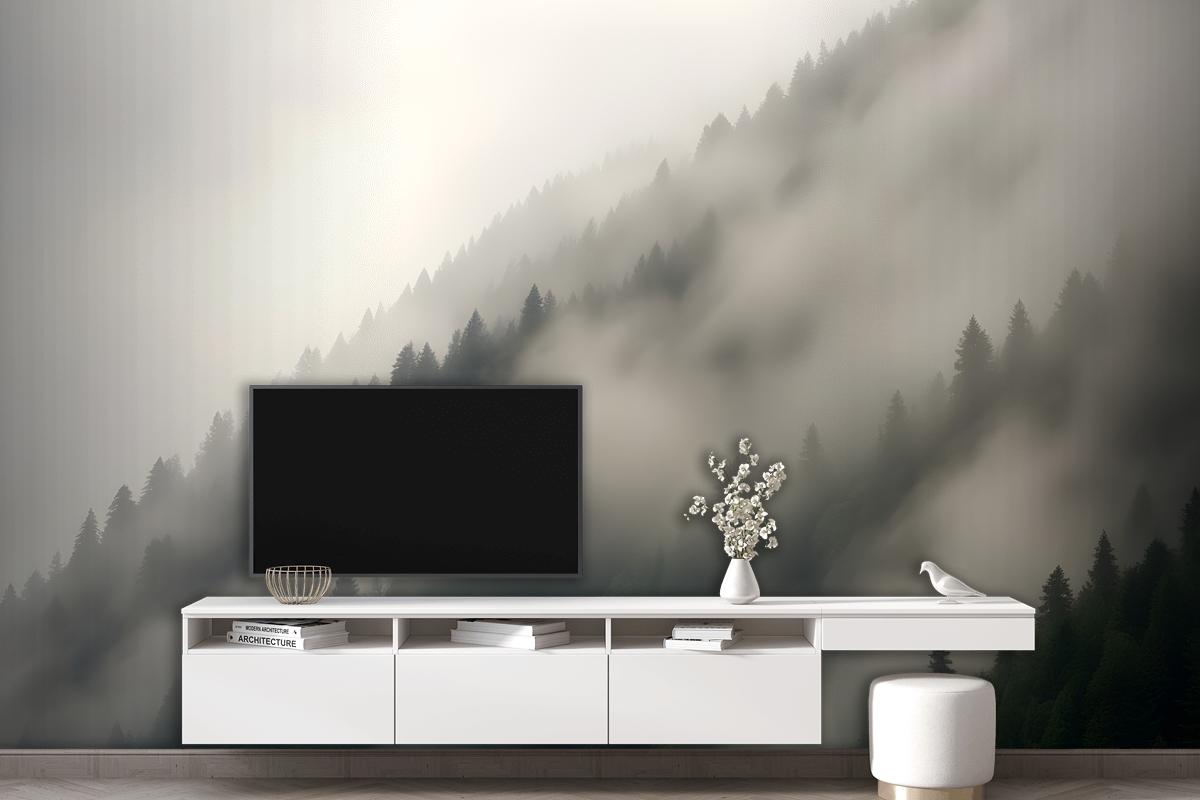 Ormanlı Yamaçları Kaplayan Yoğun Sisli Puslu Dağ Manzarası Oturma Odası Salon Duvar Kağıdı