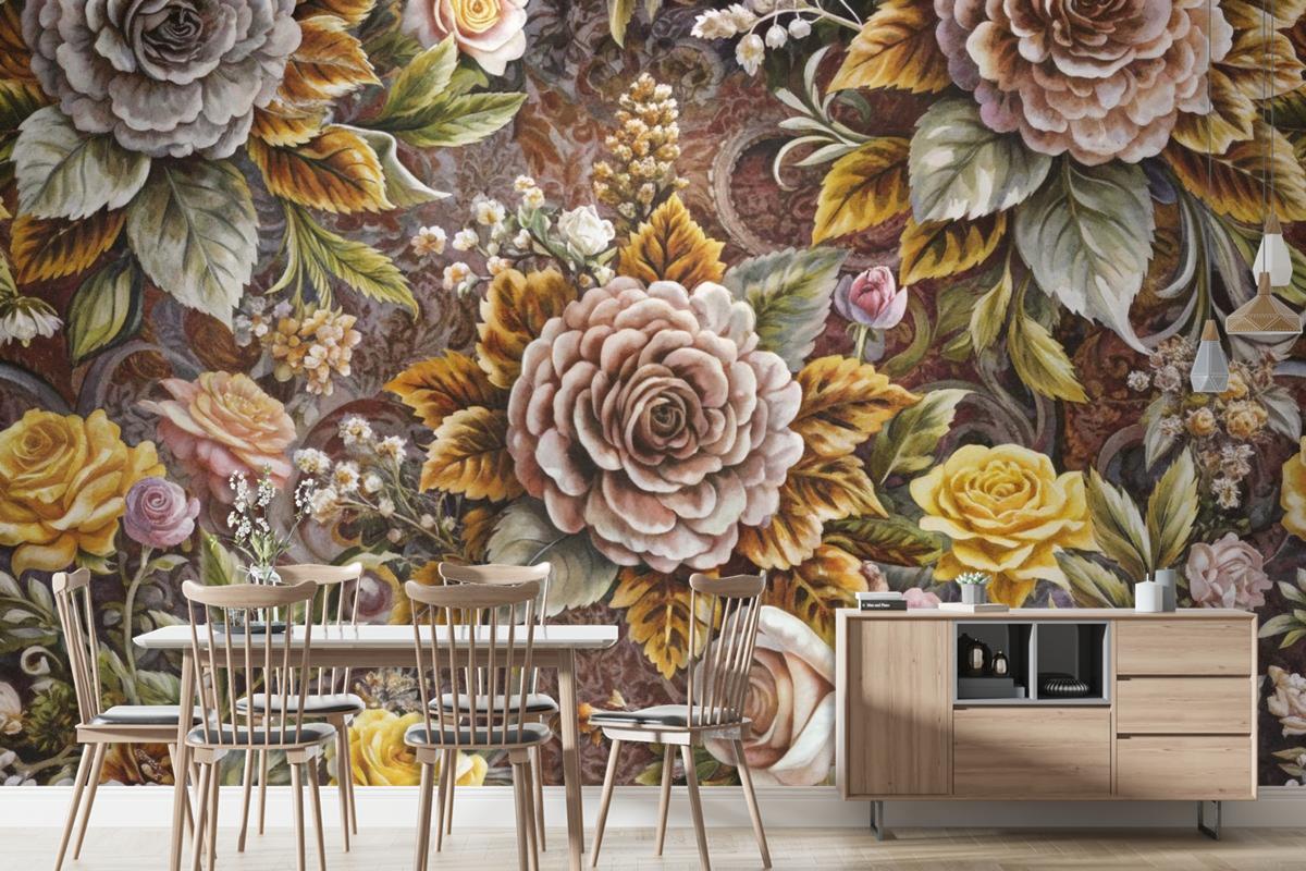 Orta Renkle Soyut Çiçek Açan Güller Çiçek Deseni Vintage Duvar Kağıdı