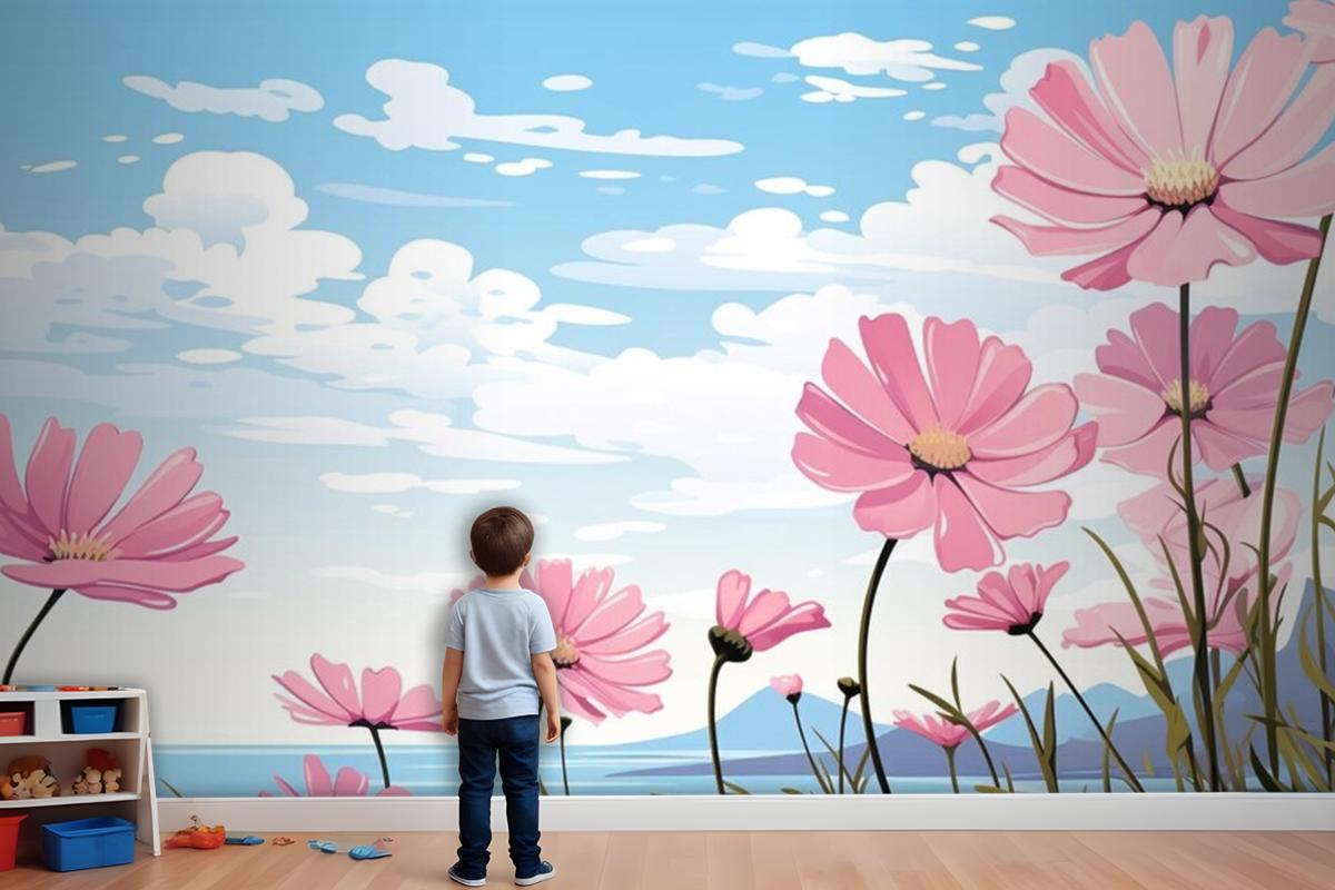 Papatyalar Çocuk Odası Duvar Kağıdı Ile Gökyüzünde Pembe Çiçeklerden Oluşan Bir Tablo