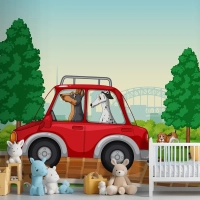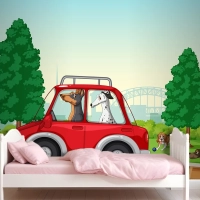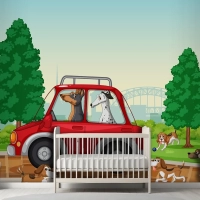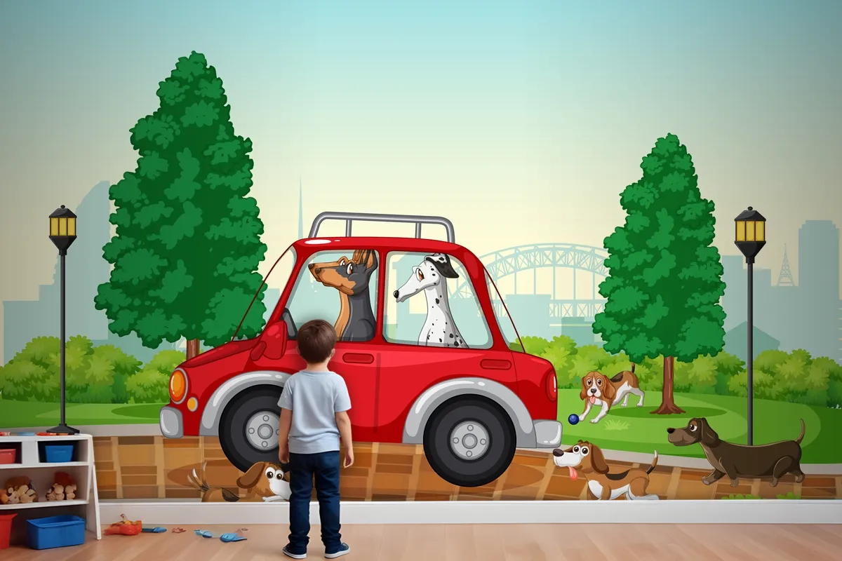 Parkta Araba Süren Ve Koşan Köpekler Çocuk Odası Duvar Kağıdı