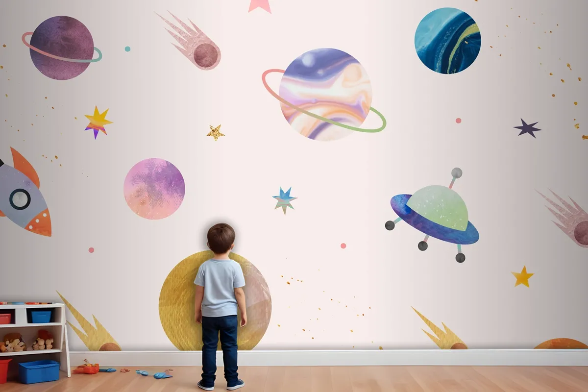 Pastel Arkaplanda Renkli Galaksi Suluboya Doodle Çocuk Odası Duvar Kağıdı