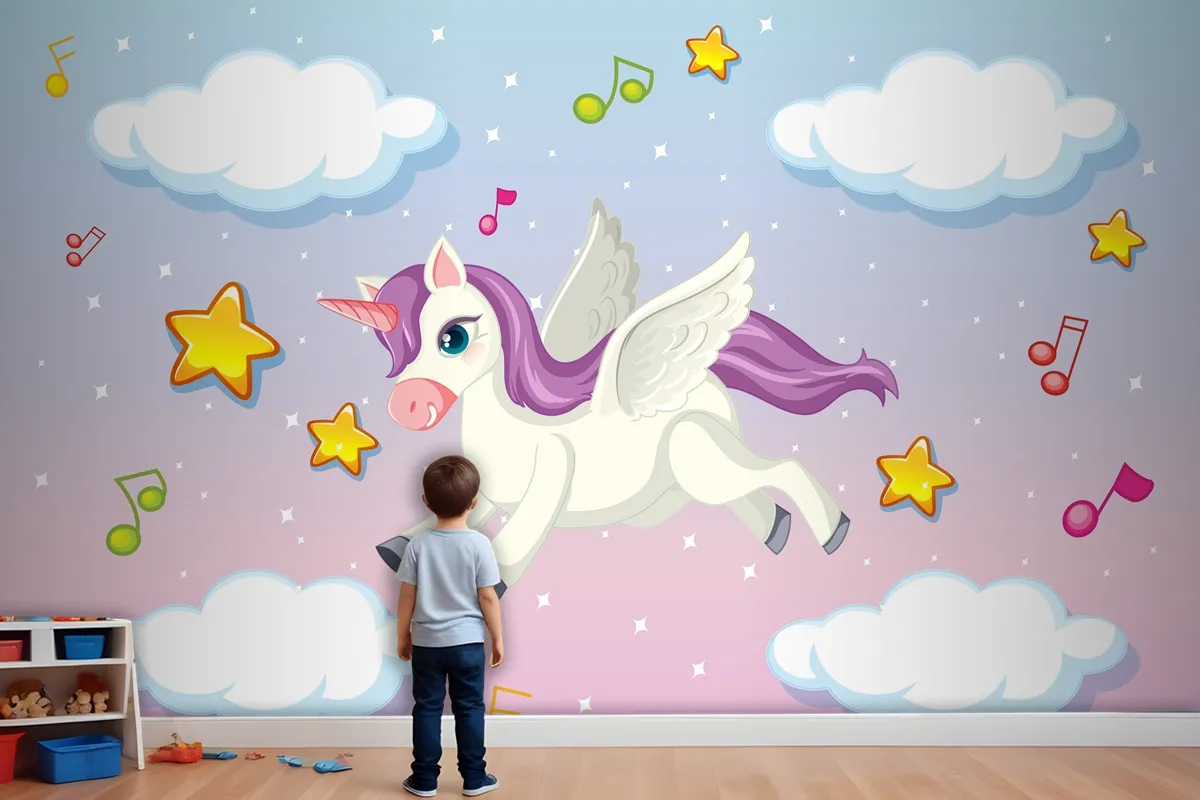 Pastel Gökyüzünde Uçan Mor Yeleli Sevimli Pegasus Çocuk Odası Duvar Kağıdı