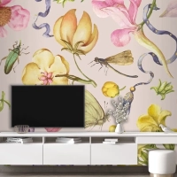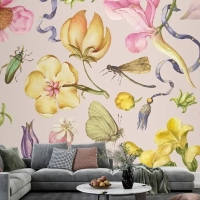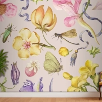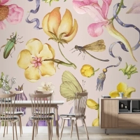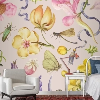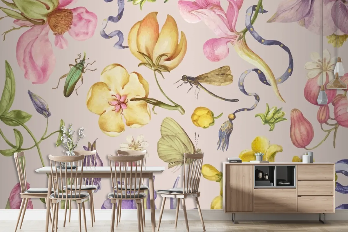 Pembe Arkaplanda Renkli Vintage Çiçek Desenli Vektör Duvar Kağıdı