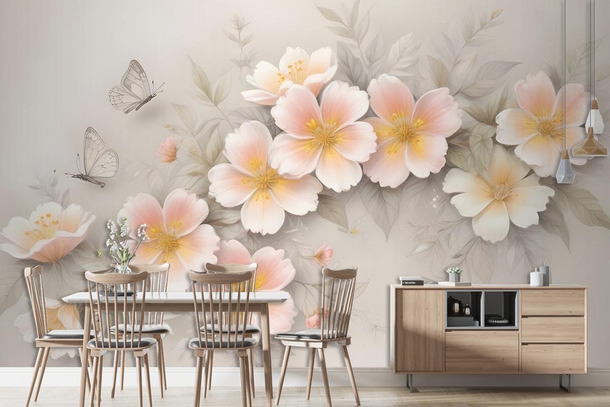 Pembe Çiçek Ve Beyaz Kelebek Duvar Kağıdı
