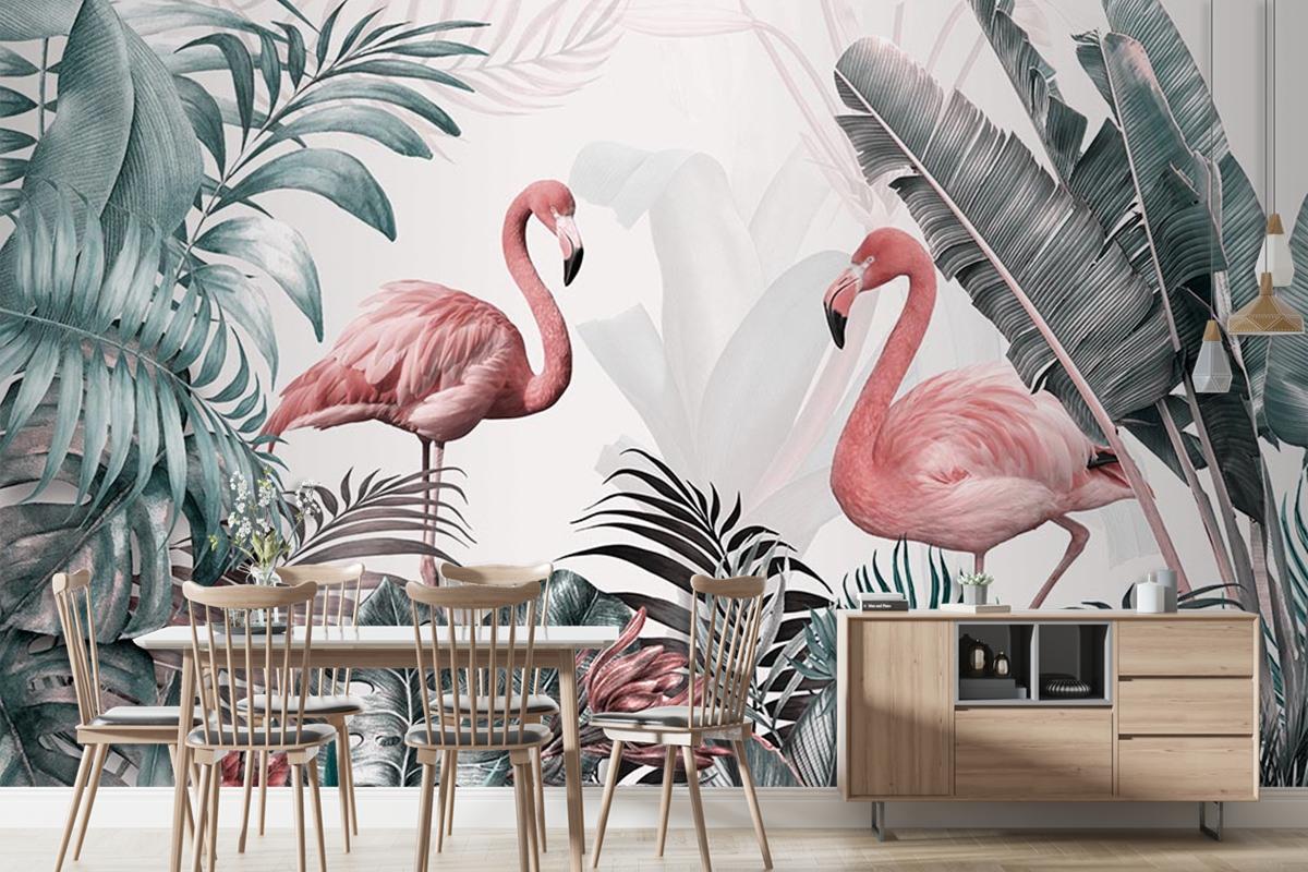 Pembe Flamingolar Ve Tropikal Yapraklar Duvar Kağıdı