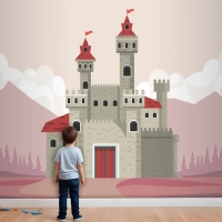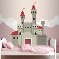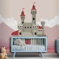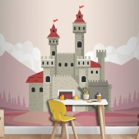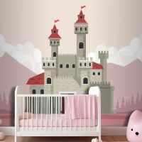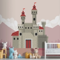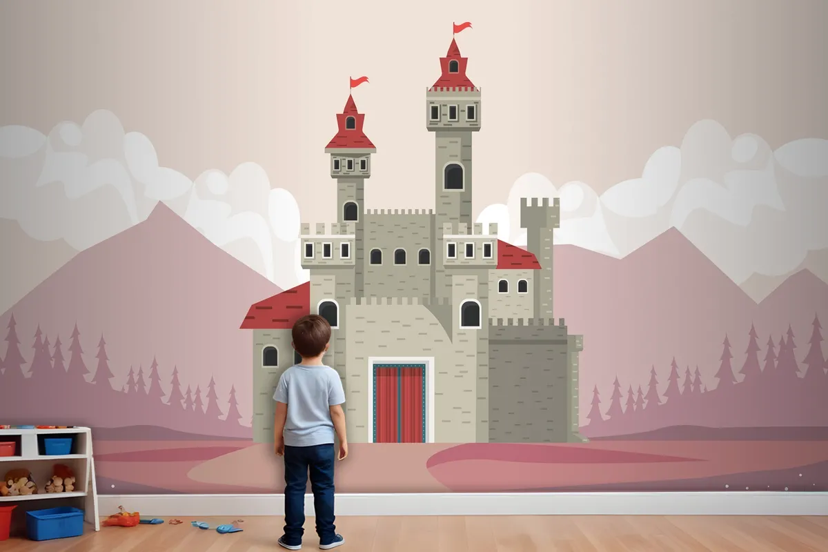 Pembe Manzara Sahnesi Çocuk Odası Duvar Kağıdı Duvarındaki Gri Kale
