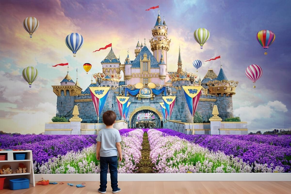 Peri Kalesi Manzara Çiçekler Sıcak Hava Balonları Çocuk Odası Duvar Kağıdı