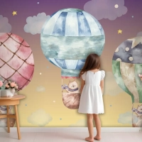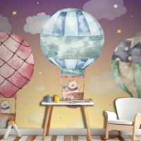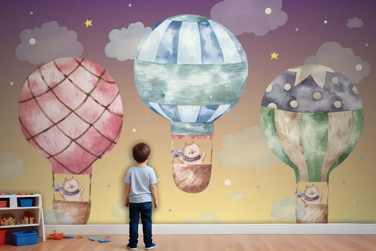 Renkli Balonların Üzerinde Uçan Sevimli Kahverengi Kedi Çocuk Odası Duvar Kağıdı