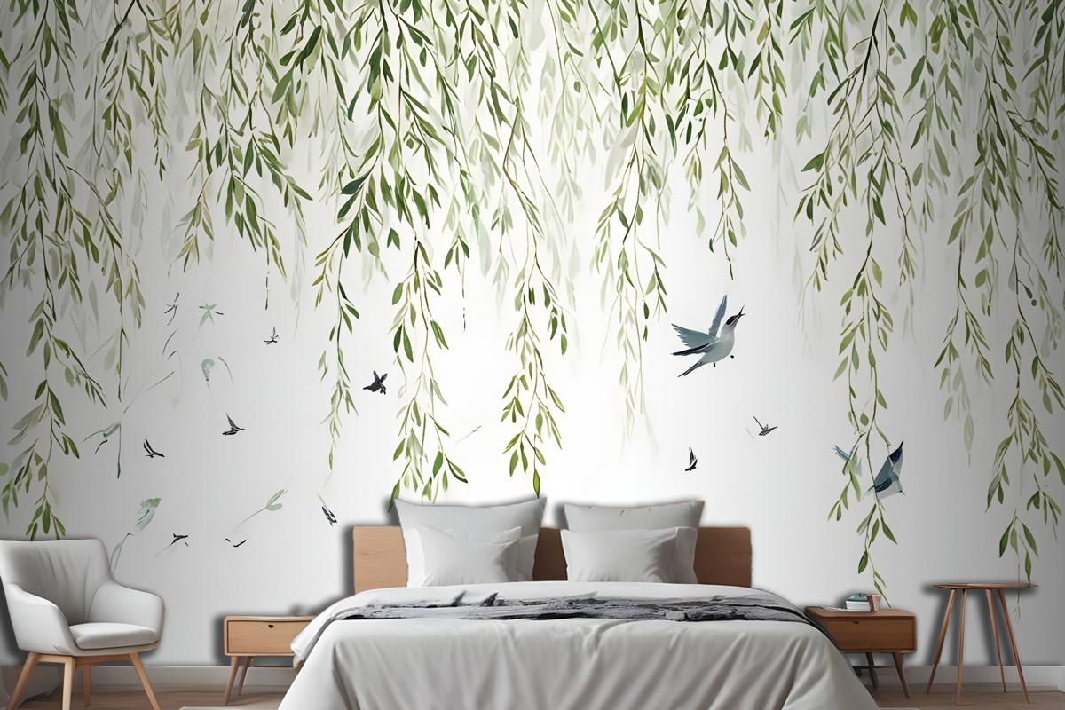 Renkli Kuşlar İle Yeşil Asılı Yapraklar Yatak Odası Duvar Kağıdı