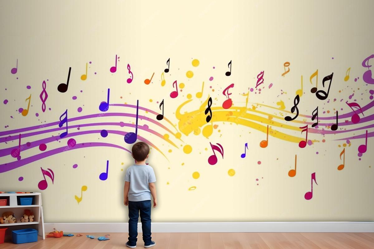 Renkli Müzik Notaları Sarı Arka Plan Çocuk Odası Duvar Kağıdı