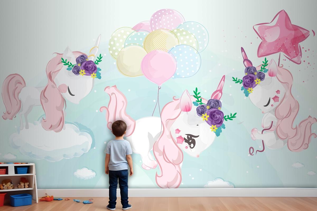 Renkli Suluboya Tarzında Sevimli Küçük Tek Boynuzlu At Çocuk Odası Duvar Kağıdı