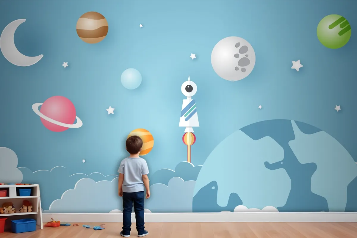 Roket Gezegenler Gibi Çeşitli Gök Nesneleriyle Çevrelenmiş Çocuk Odası Duvar Kağıdı