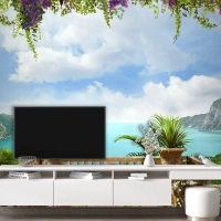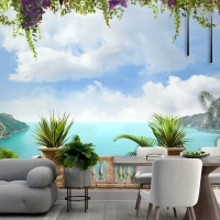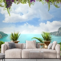 Romantik Perde Detaylı Deniz Manzaralı Duvar Kağıdı