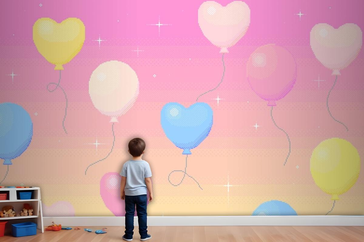 Rüya Gibi Gökyüzünde Uçan Balonların Piksel Sanat Arka Planı Çocuk Odası Duvar Kağıdı