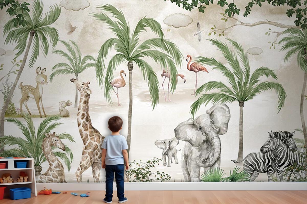 Safari Hayvanları Çocuk Odası Duvar Kağıdı Tropikal Safari Wallpaper