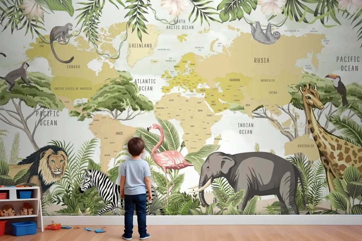Safari Hayvanları Zürafa Zebra Aslan Flamingo Çocuk Odası Duvar Kağıdı