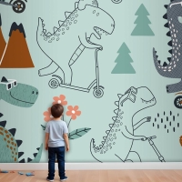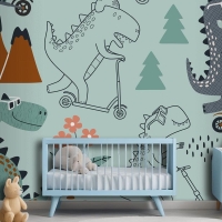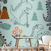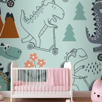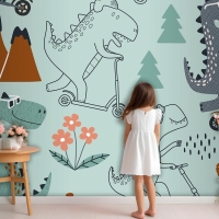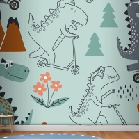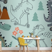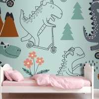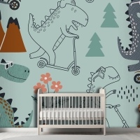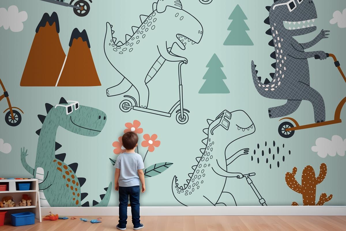 Sevimli Dinozor Scootera Biniyor Çocuk Odası Duvar Kağıdı