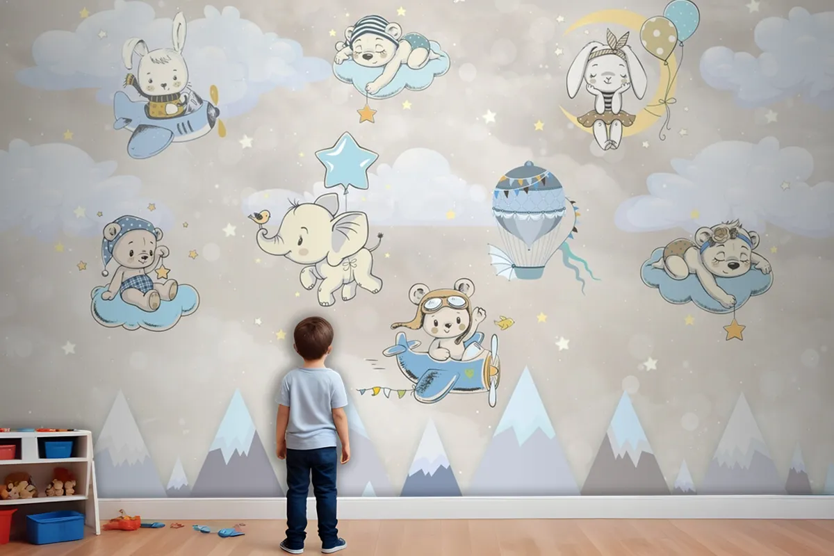 Sevimli Hayvanlar Bulutlar Dağlar Çocuk Bebek Odası Duvar Kağıdı