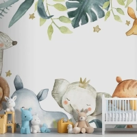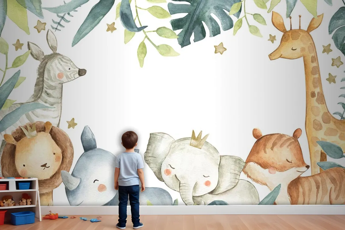Sevimli Hayvanlar Tropikal Yapraklar Çocuk Odası Duvar Kağıdı