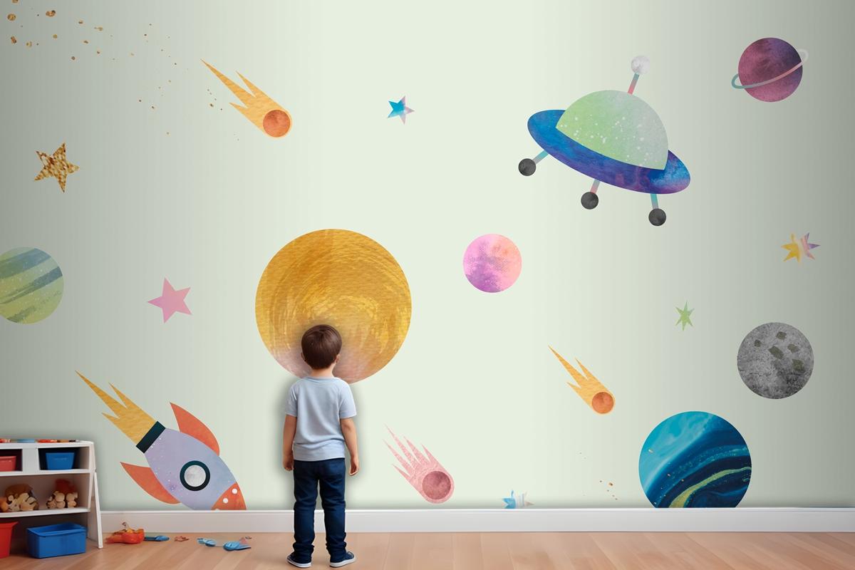 Sevimli Suluboya Tarzında Renkli Galaksi Desenli Arka Plan Çocuk Odası Duvar Kağıdı