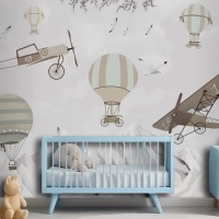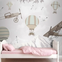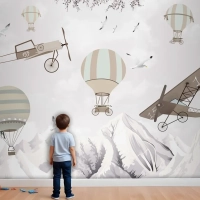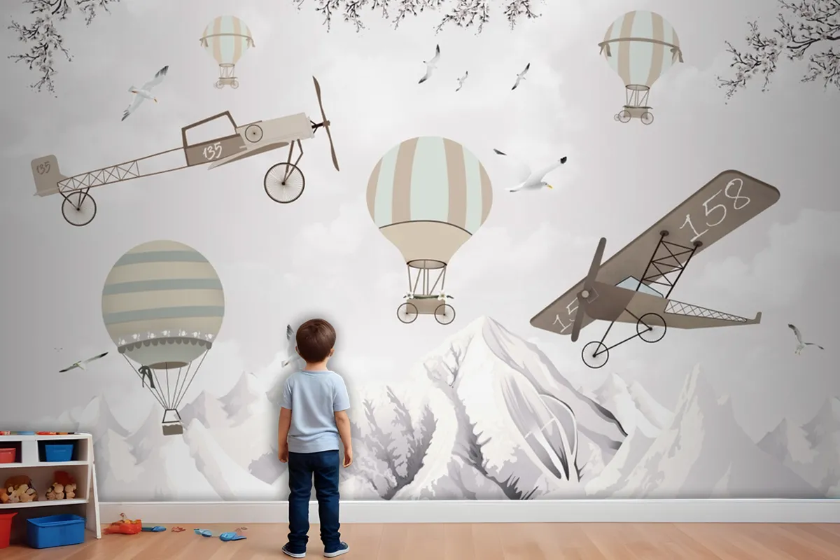 Sıcak Hava Balonları Çizimi Dağlar Manzara Uçaklar Çocuk Duvar Kağıdı