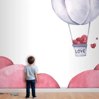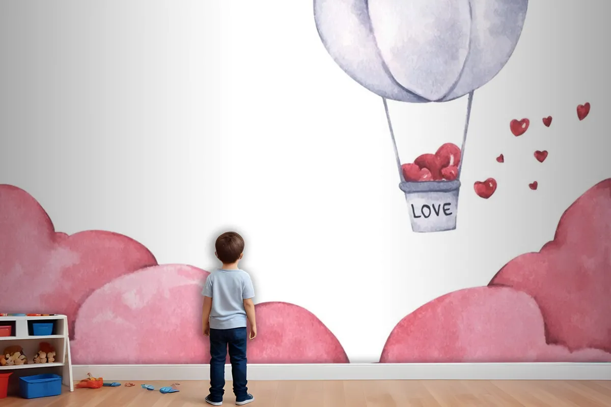 Sıcak Hava Balonu Gökyüzünde Yüzen Kalpli Çocuk Odası Duvar Kağıdı