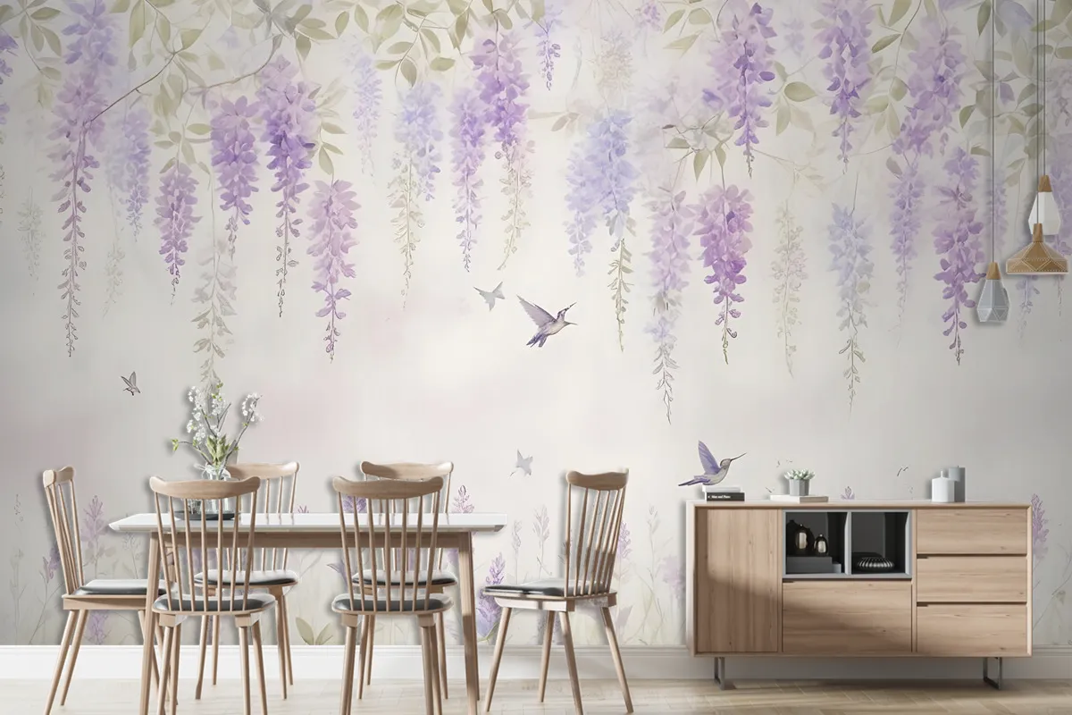 Sinek Kuşları Duvar Kağıdı Ile Suluboya Asılı Wisteria Çiçekleri