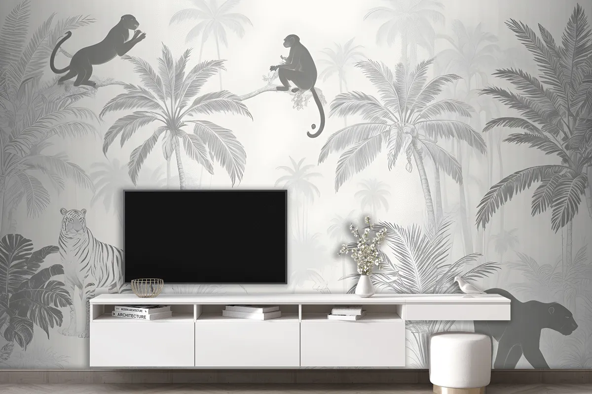 Siyah Beyaz Orman Palmiye Ağaçları Çiçekler Hayvan Siluetleri Oturma Odası Salon Duvar Kağıdı