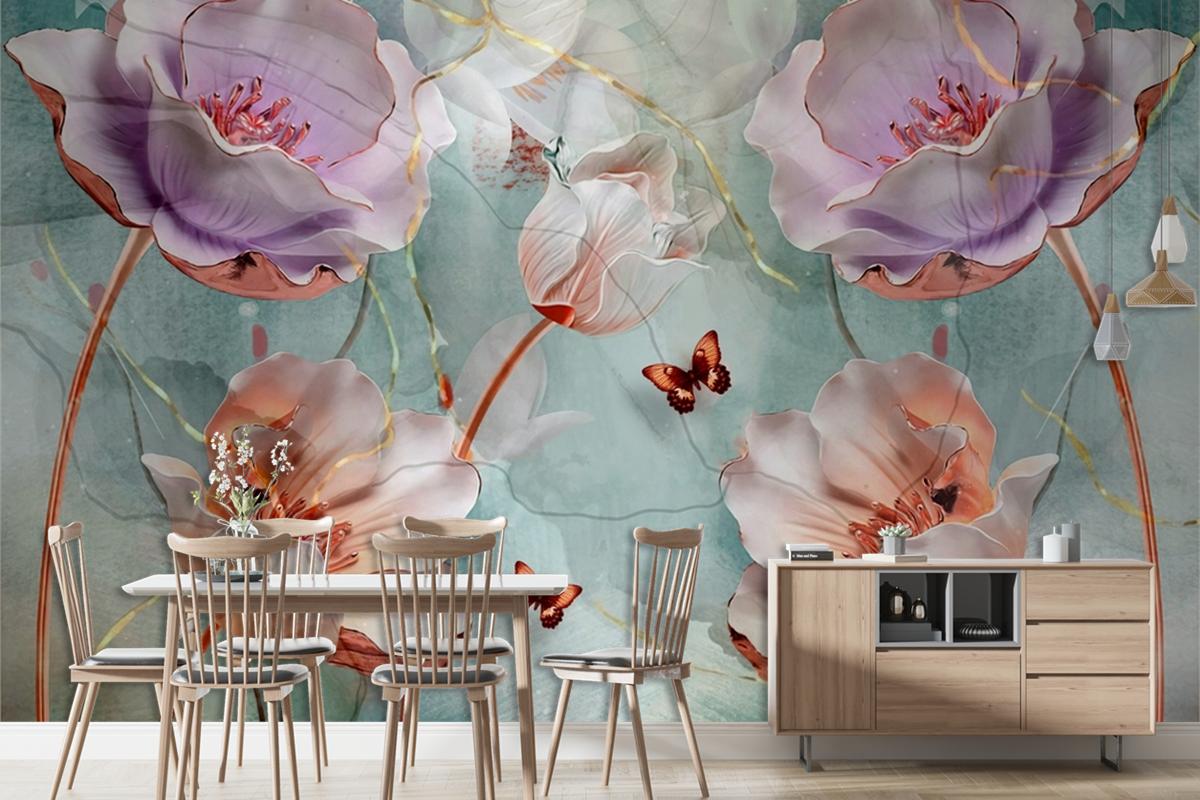 Su Yeşlili Arka Plan Ve 3D Çiçek Duvar Kağıdı