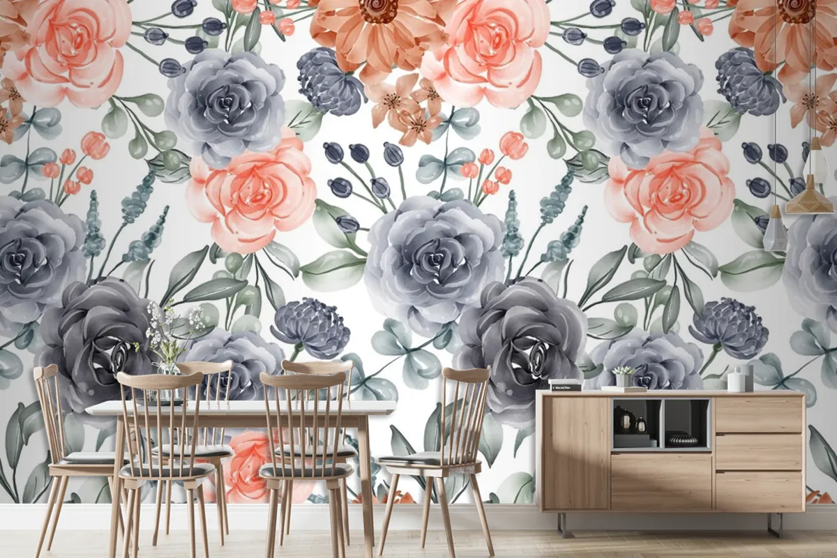 Suluboya Arka Plan Dikişsiz Desen Çiçek Lacivert Ve Şeftali Duvar Kağıdı