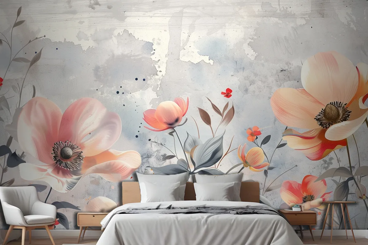 Suluboya Çiçekler Mavi Yatak Odası Duvar Kağıdı