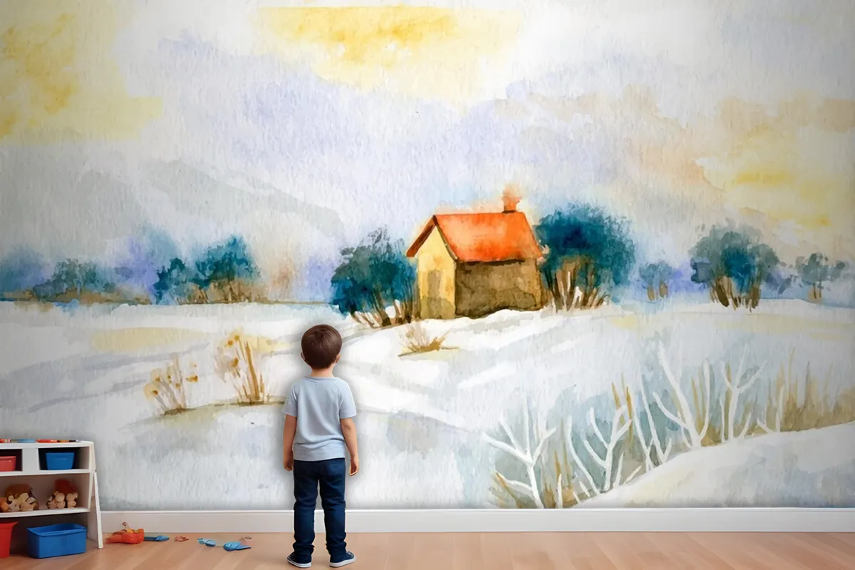 Suluboya Kış Manzarası Çocuk Odası Duvar Kağıdı