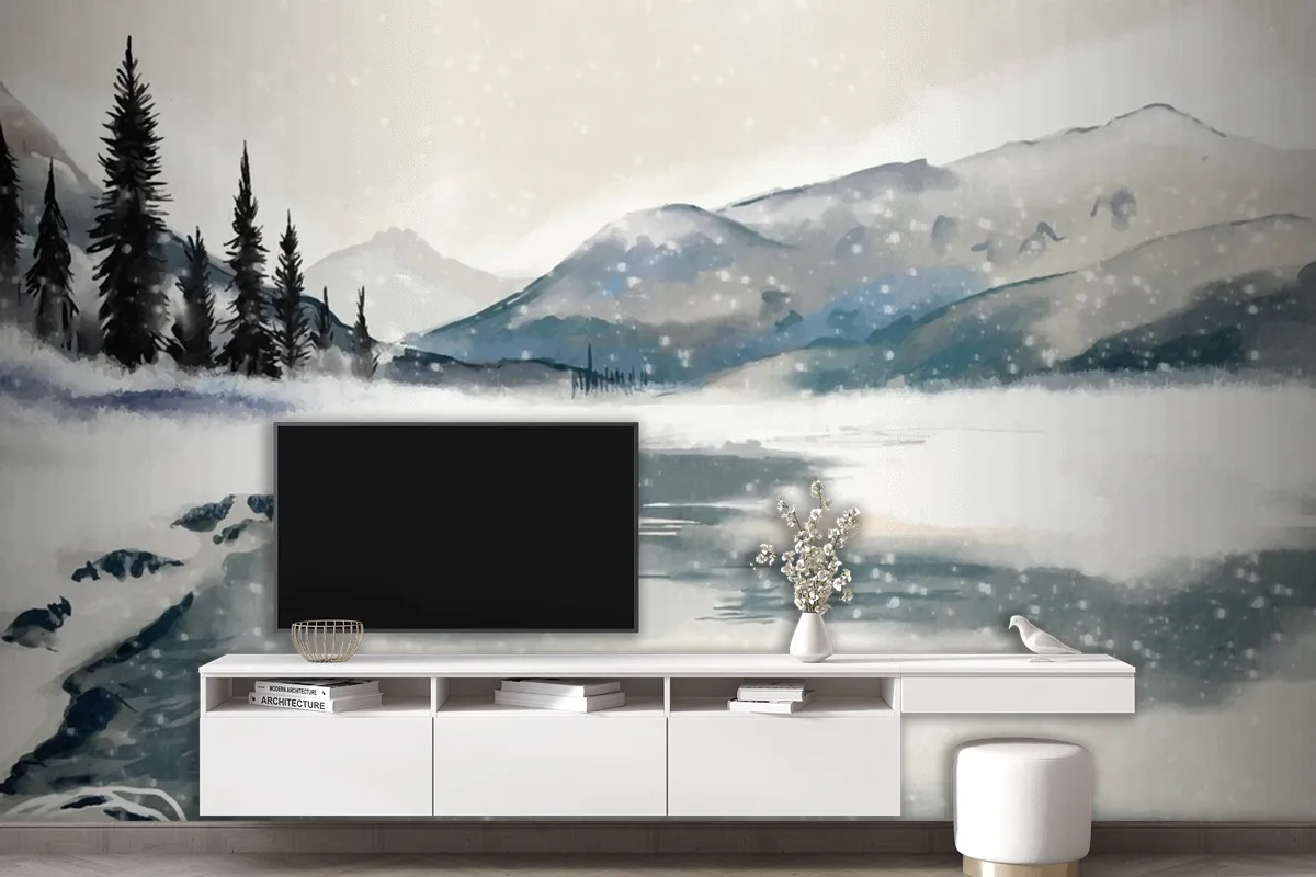 Suluboya Kış Manzarası Oturma Odası Duvar Kağıdı