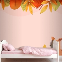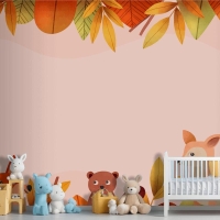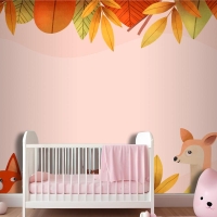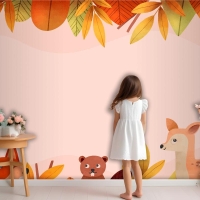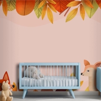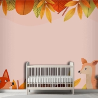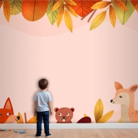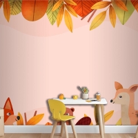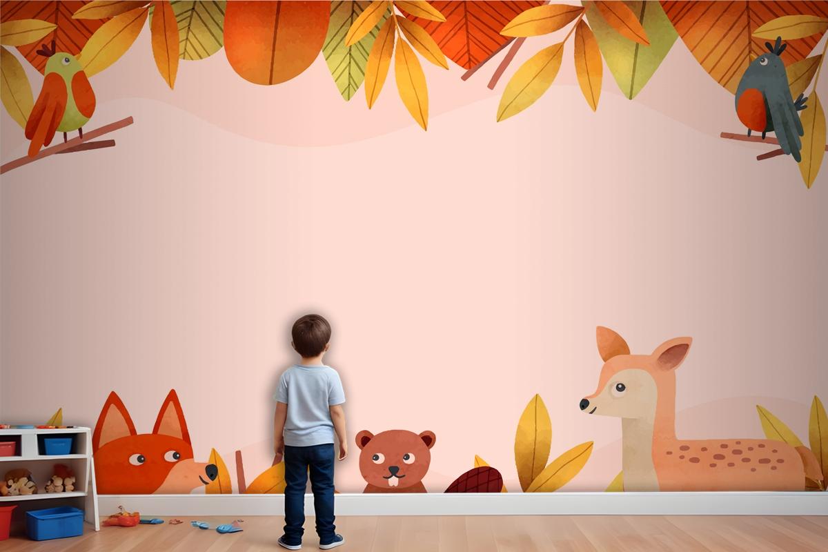 Suluboya Orman Hayvanı Ve Yaprakları Çocuk Odası Duvar Kağıdı