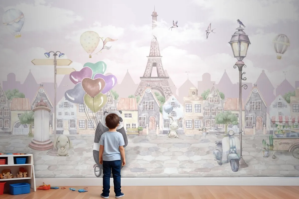 Suluboya Paris Sokağı Eski Şehir Bisikletli Panda Çocuk Bebek Odası Duvar Kağıdı