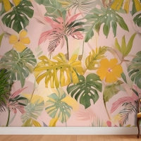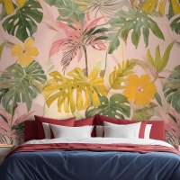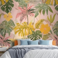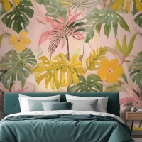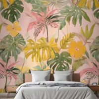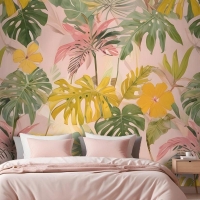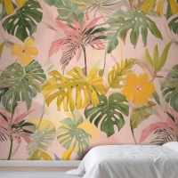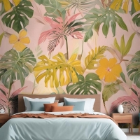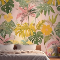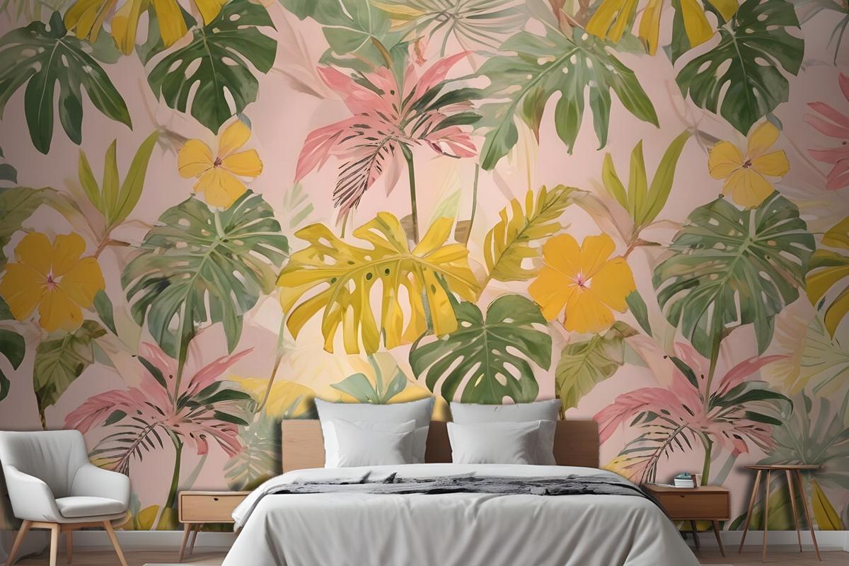 Suluboya Renkli Yaz Tropikal Yaprak Yatak Odası Duvar Kağıdı