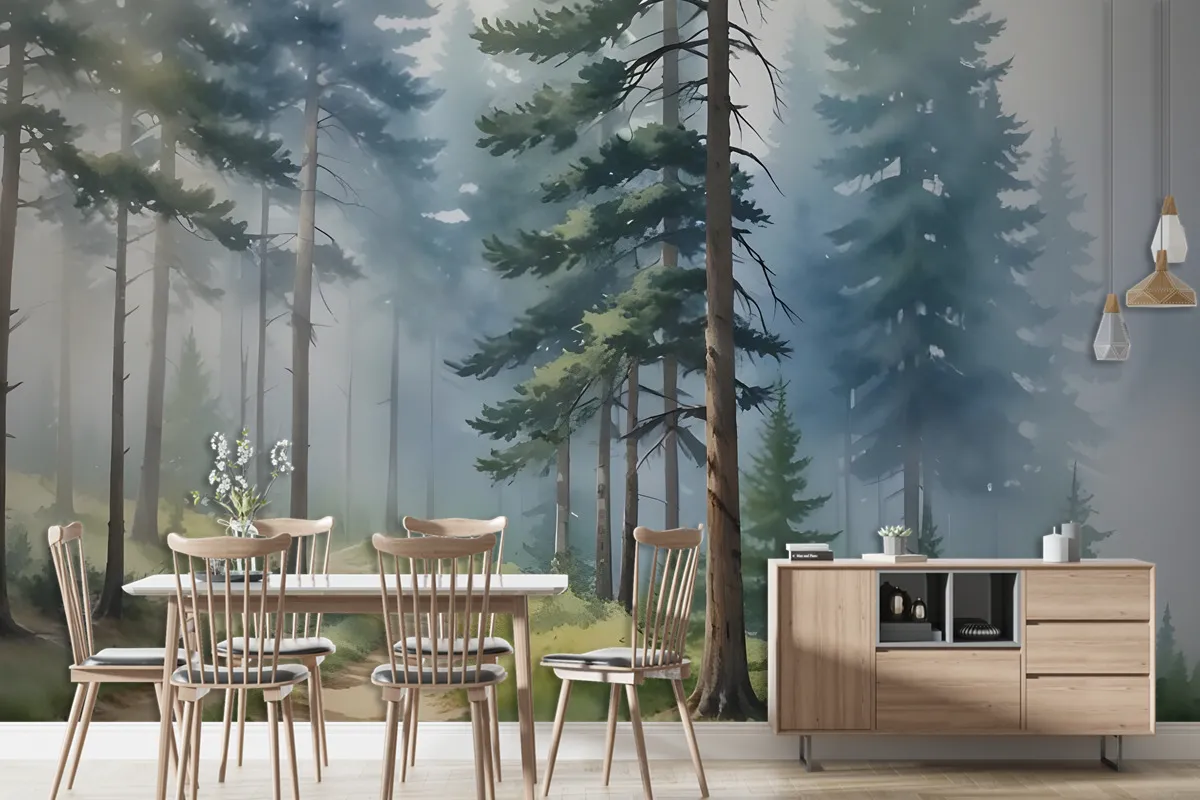 Suluboya Resim Puslu Orman Manzarası Duvar Kağıdı