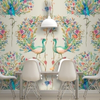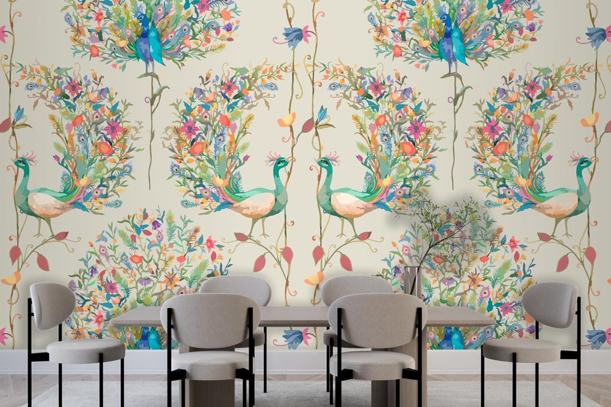 Suluboya Tavus Kuşu Ve Çiçek Yemek Odası Duvar Kağıdı