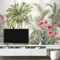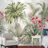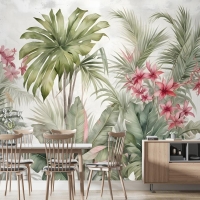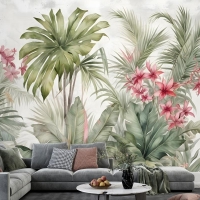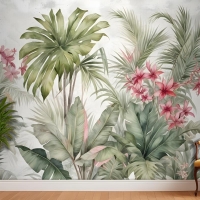 Suluboya Tropikal Yaprak Ve Çiçekler Duvar Kağıdı