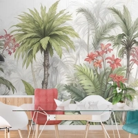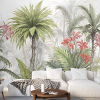 Suluboya Tropikal Yaprak Ve Çiçekler Duvar Kağıdı