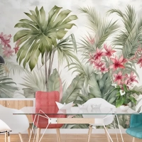 Suluboya Tropikal Yaprak Ve Çiçekler Duvar Kağıdı