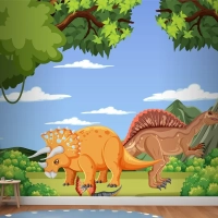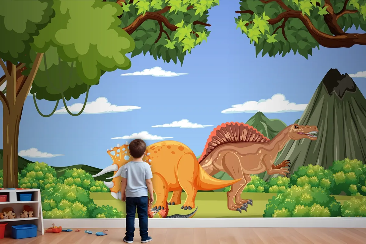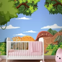 Tarih Öncesi Orman Sahnesinde Dinozor Çocuk Odası Duvar Kağıdı